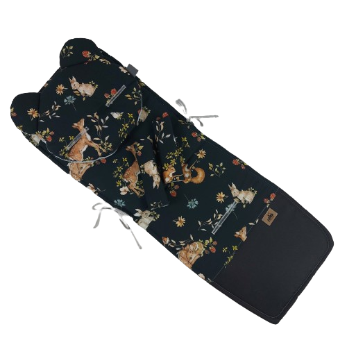 - po środku podnóżka wszyta gumka do zamocowania pod podnóżkiem lub pod dolną częścią wózka (w przypadku wózków bez ruchomych podnóżków)